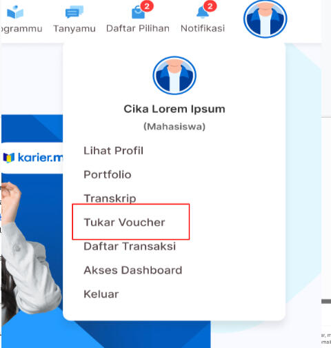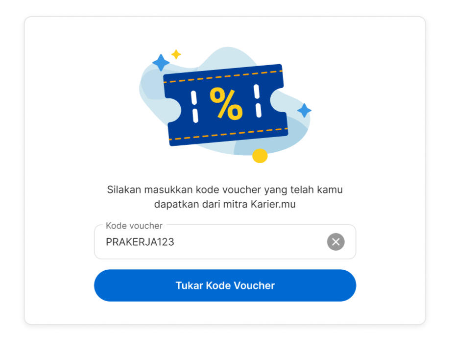 Silakan kamu mengikuti langkah-langkah di bawah ini:1. Buka Aplikasi Karier.mu atau website https://www.karier.mu/.2. Apabila belum memiliki akun Karier.mu, silakan melakukan pendaftaran akun terlebih dahulu. Namun jika sudah memiliki akun, silakan login akun.3. Klik Akun Profil yang berada di bagian pojok kanan atas halaman utama Karier.mu.4. Pilih “Tukar Voucher”.