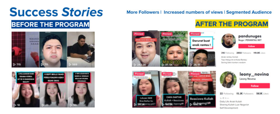 Transformative learning adalah fokus moda pembelajaran kami. Lewat pengalaman bertahun-tahun dengan expertise di industri kreatif, kami memprioritaskan metode pembelajaran yang tidak hanya berdasarkan teori namun juga praktek secara kontinu. Dengan rangkaian kelas berbasis cohort, salah satunya program berdurasi 14 hari, telah berhasil mentransformasi mereka yang baru pertama kali berhadapan dengan media sosial untuk menemukan trafik dan juga audiensnya. Bahkan tidak jarang yang melanjutkan karirnya sebagai kreator konten sebagai pekerjaan penuh maupun paruh waktu.Program bootcamp kami tidak hanya mencakup pembelajaran teknis, tapi juga pembentukan fundamental termasuk di dalamnya pengenalan diri, pemetaan audiens dan masalah sehingga peserta dapat menemukan formula dan strategi yang tepat bagi perjalanan karir mereka di media sosial.Gabungan antara moda online bersifat webinar, modul yang harus dikerjakan, dan juga diskusi dalam kelompok yang memberikan pengalaman untuk saling memberikan feedback satu sama lain.Mari jelajahi bakat dan kreativitas kamu bersama kami dan bersiaplah untuk mengambil langkah maju dalam dunia konten kreator.
